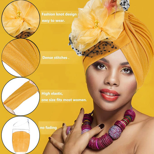 Women's Turbans Pure Color Big Flower Mesh Style Accessible Luxury Wedding Important Occasions Wear Forehead Cross Fashion Turban Hat African Zahra Cap