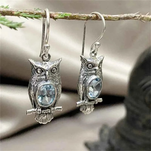 Vintage Silver Color Metal Carving Owl Earrings Originality Roung Inlaid Sea Blue Stone Dangle Earrings