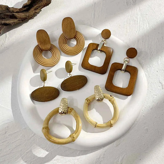 AENSOA Vintage Geometric Wood Drop Earrings for Women Handmade Brown Color Leaf Shaped Round Circle Wooden Earrings Jewelry 2022