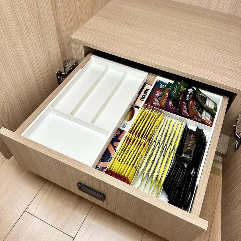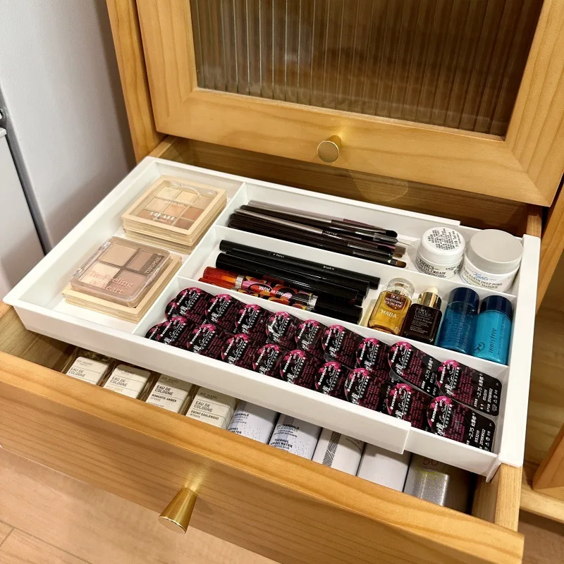 1.Expandable and portable, it can store spoons, forks, makeup brushes, and stationery pens. It can be placed inside a drawer or on a drawer divider for layered use.