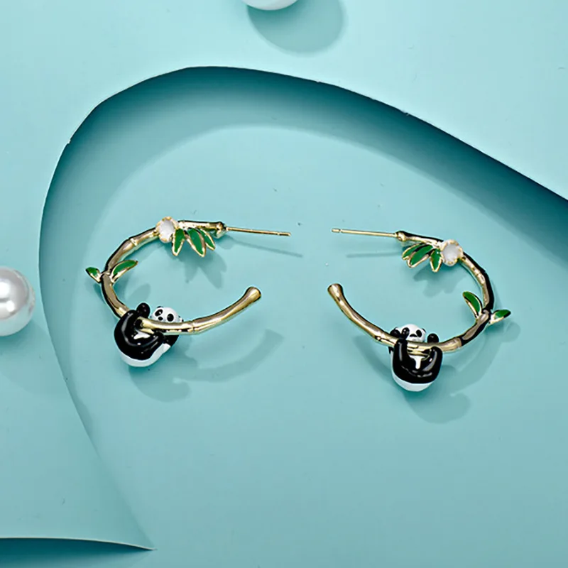 Small niche luxury panda bamboo ear rings, grand and eye-catching, slim and dripping oil earrings for women