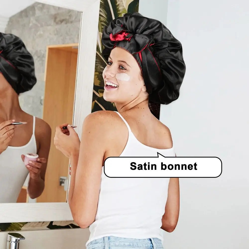 1.Double Layer Sleep Bonnet:Double-layer design, soft and comfortable, double-layer hair care, reduce the friction on the hair when sleeping.