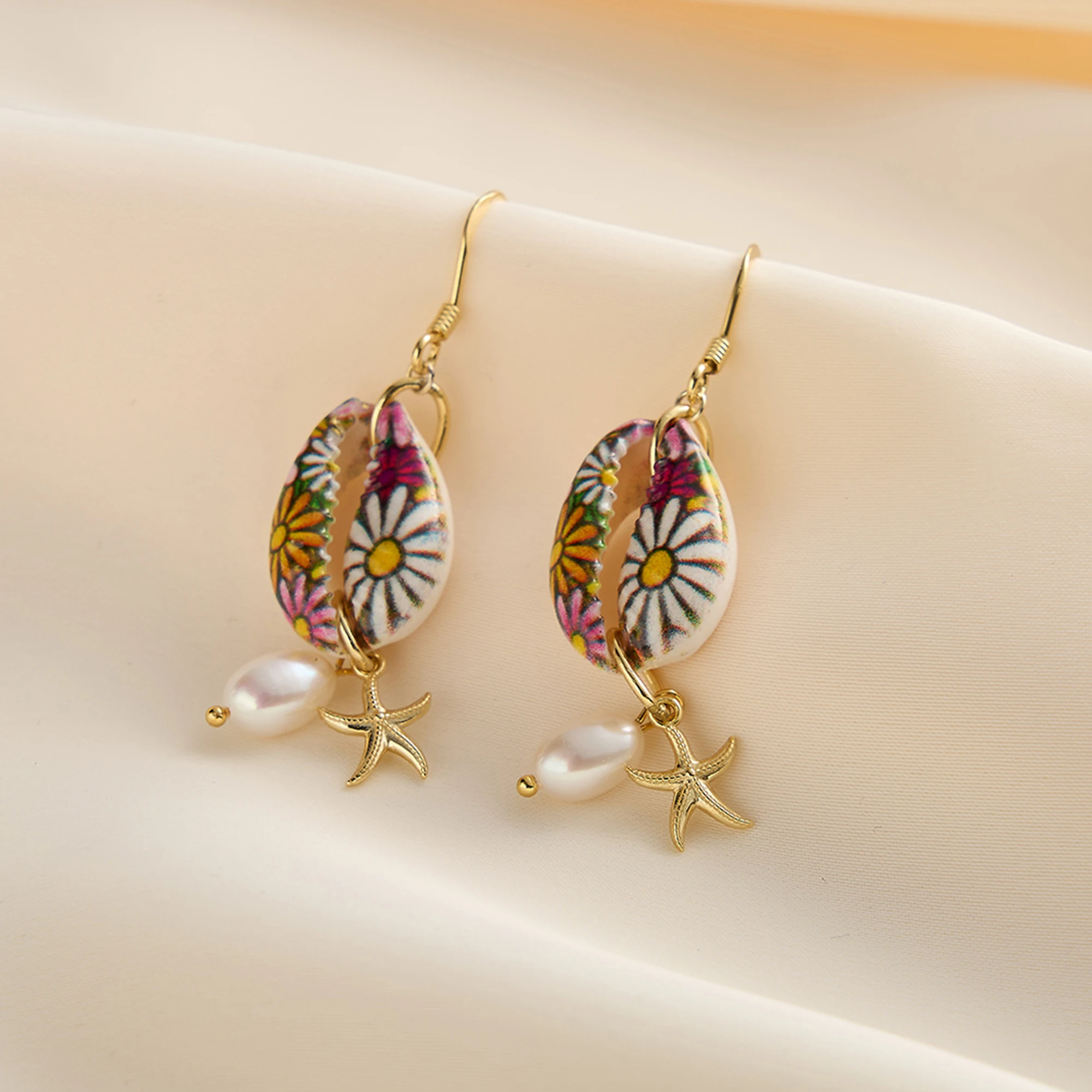 Effie Queen Natural Freshwater Pearls With Starfish Style & Floral Pattern Ornament 925 Sterling Silver Dangle Earrings