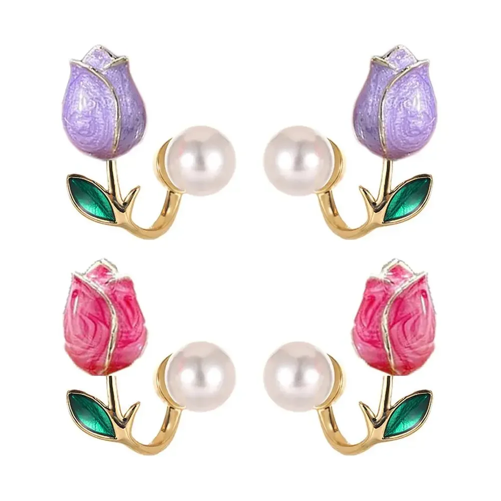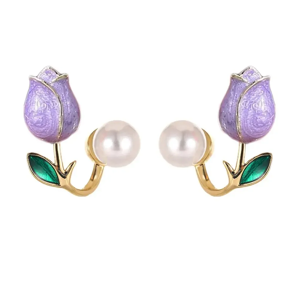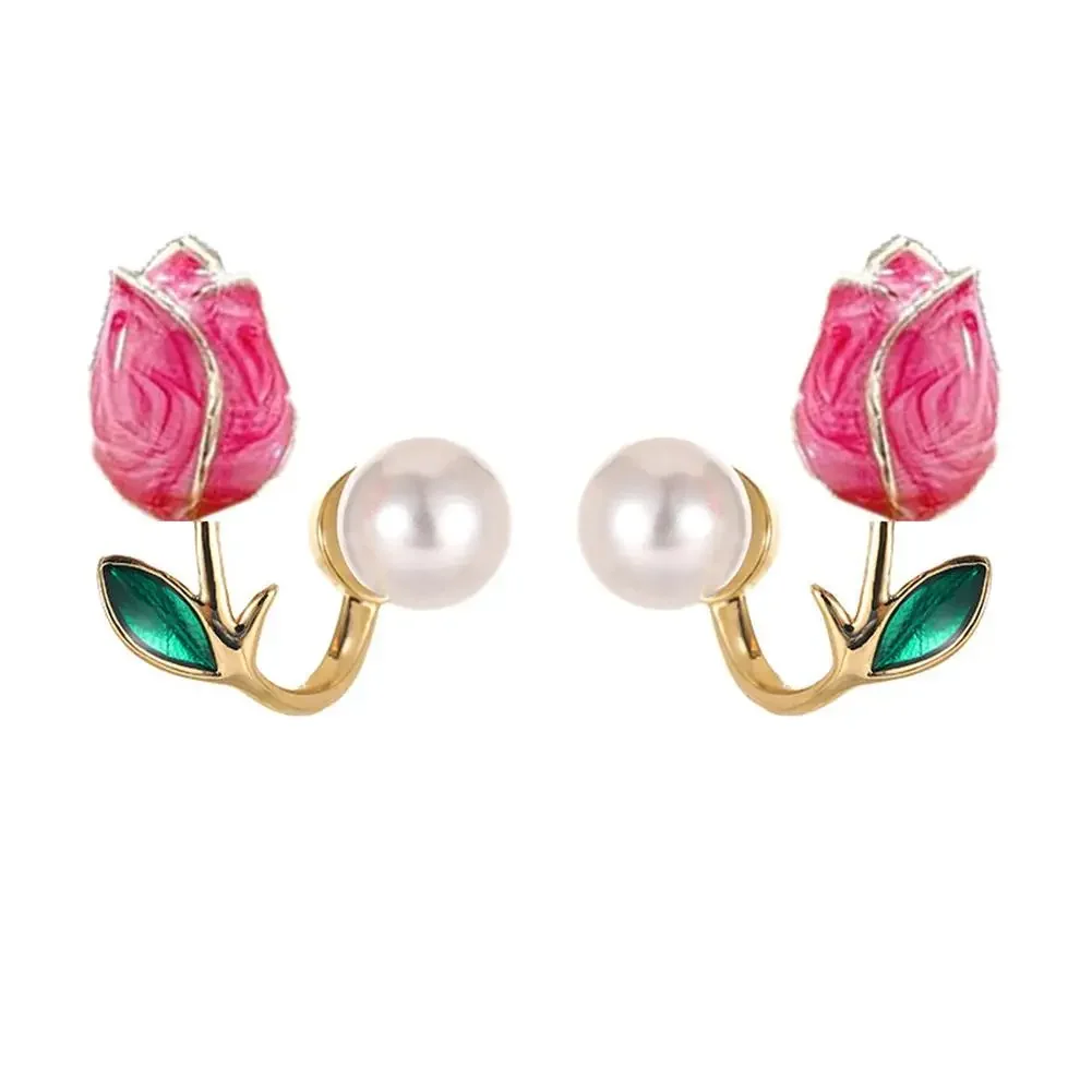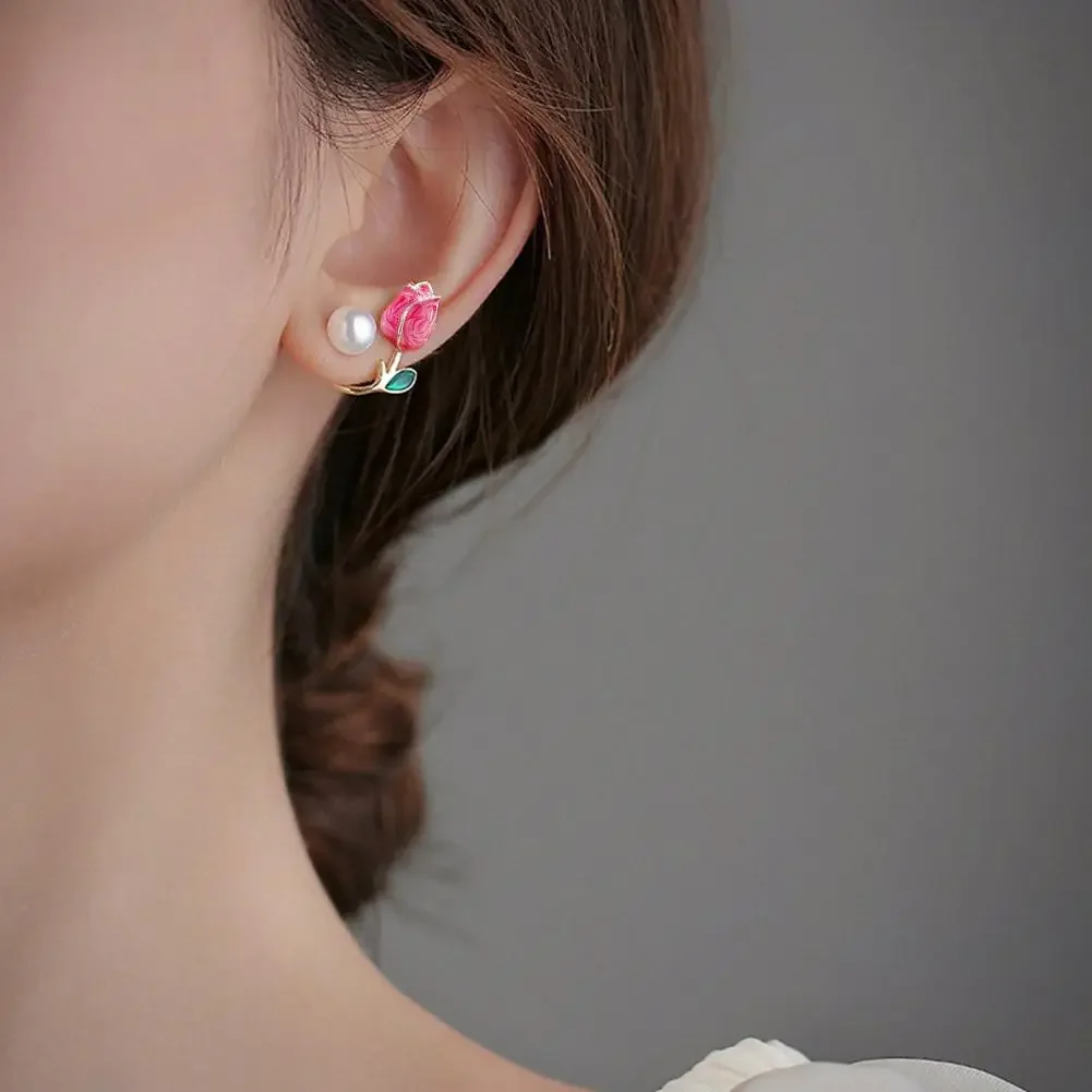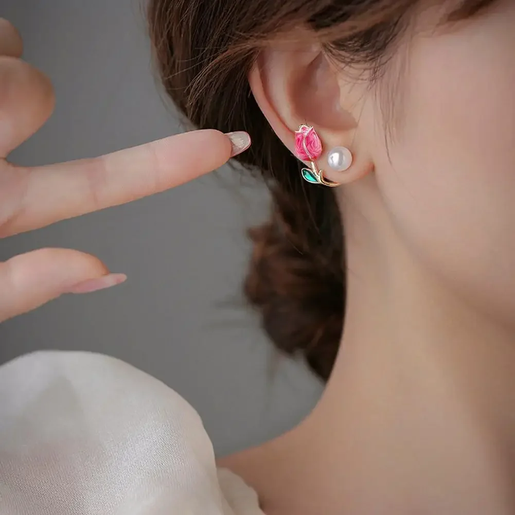 French Light Luxury Pink Tulip Flower Pearl Stud Earrings For Women Korean Zircon Exquisite Earring Party Christmas Jewelry Gift