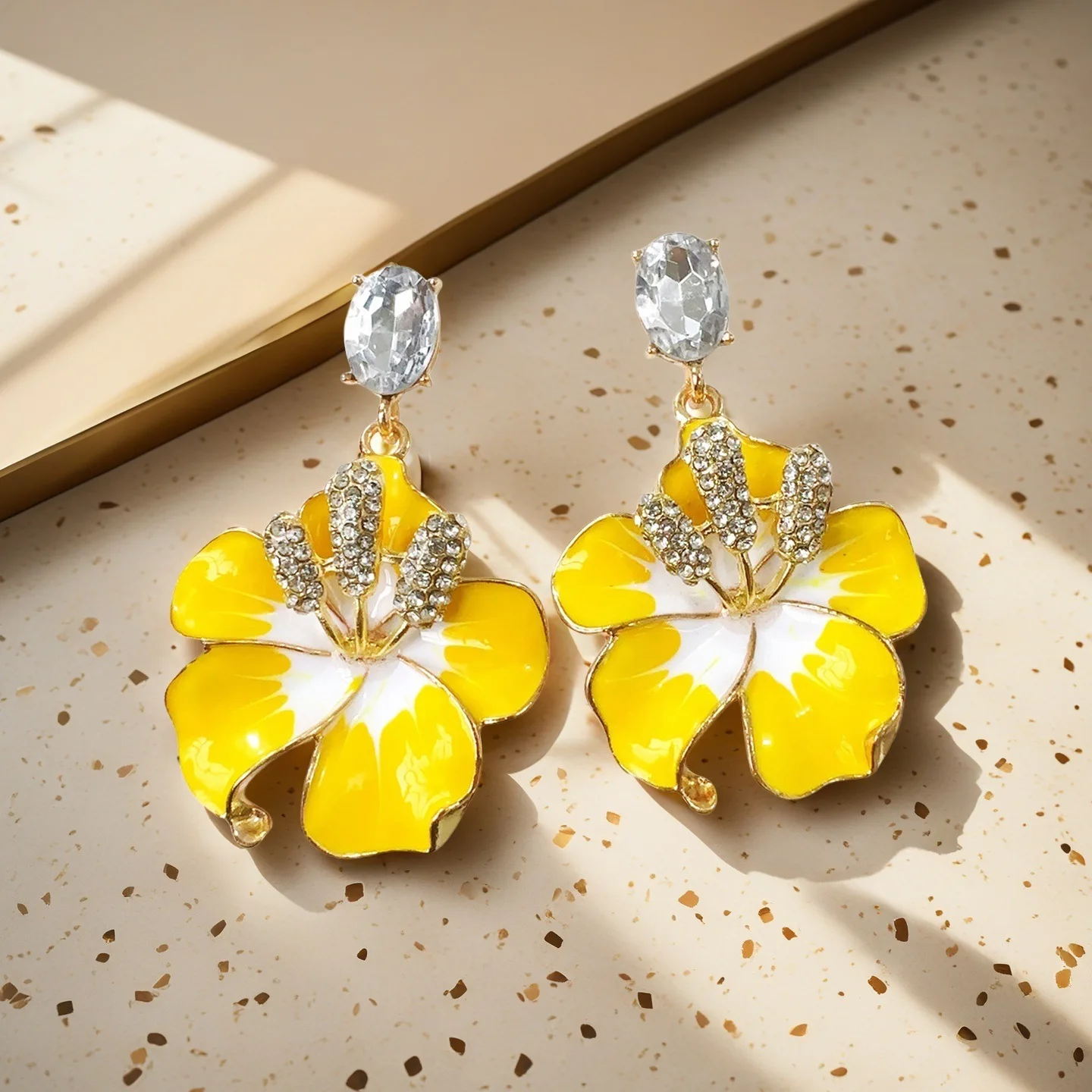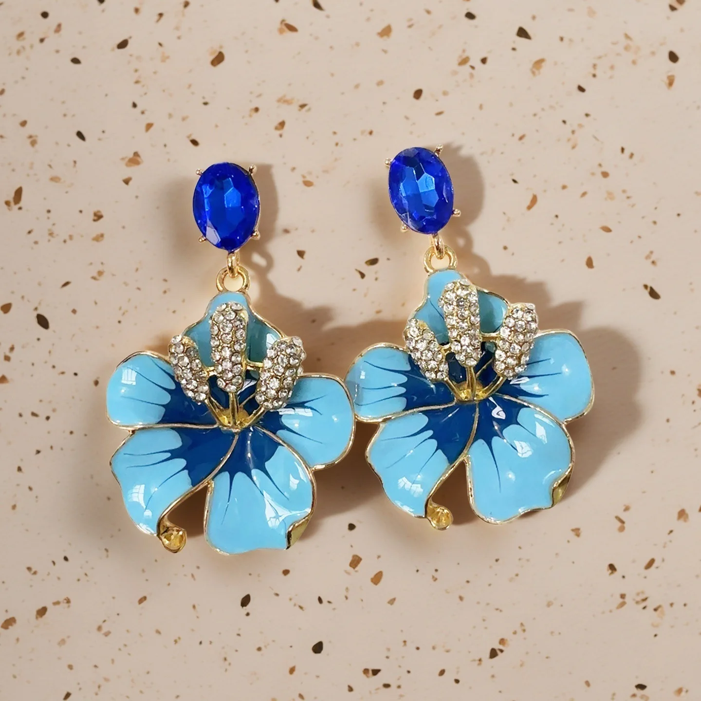 Korean Multi-color Enamel Flowers Drop Earrings for Women Girls Blue Crystal Dangle Earrings Party Jewelry Gifts