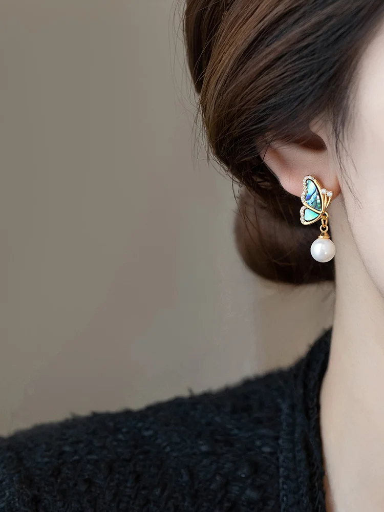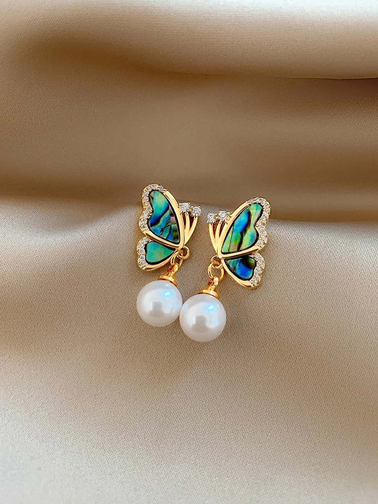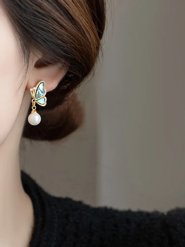 Korean new fashion jewelry 14K gold plated natural shell butterfly zircon pearl earrings elegant women's daily work accessories