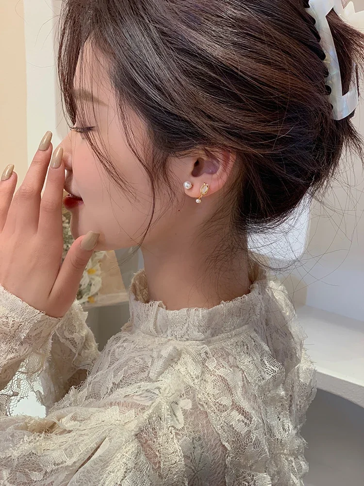 Luxury Gold Color Tulip Flower Opal Stud Earrings for Women Cute Pearl Clip Korea Earring Wedding Bride Jewelry Accessories Gift