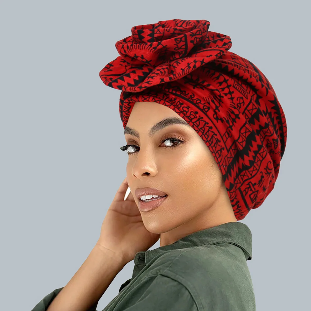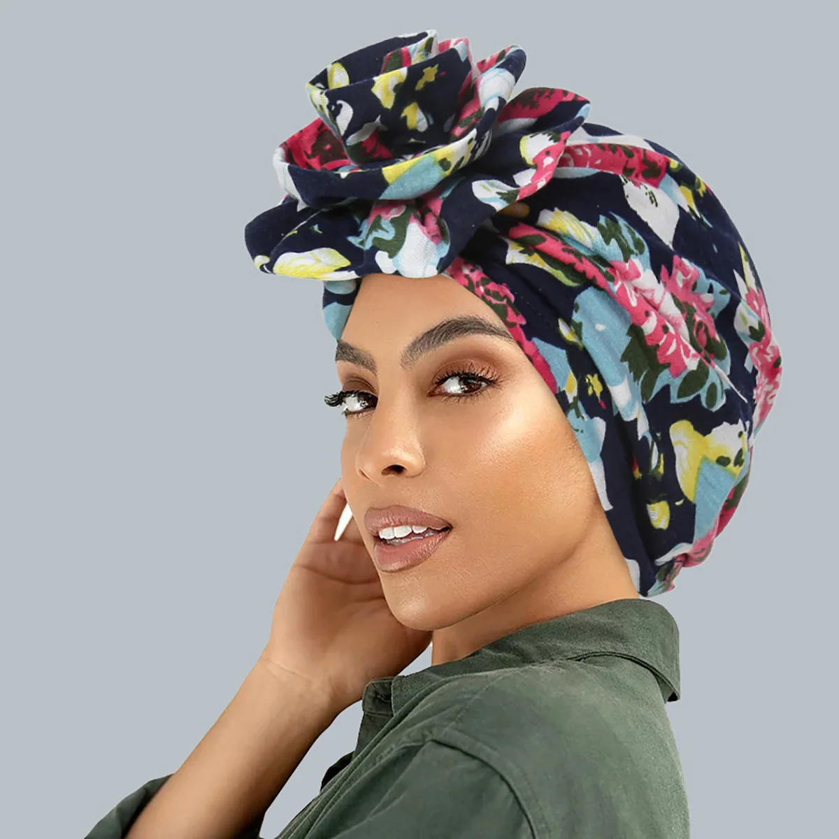 New African Print Turban Beanie for Women - Flower Beanie, Muslim Hijab, Head Wrap, and Hair Loss Bandana