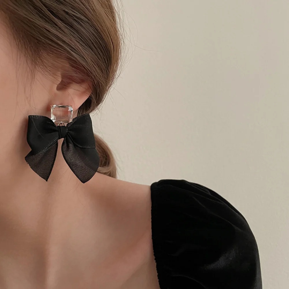 New Fashion Korean Cute Sweet Black White Women Statement Stud Earrings Fabric Lace Bow Drop Earrings Luxury Jewelry Party Gifts