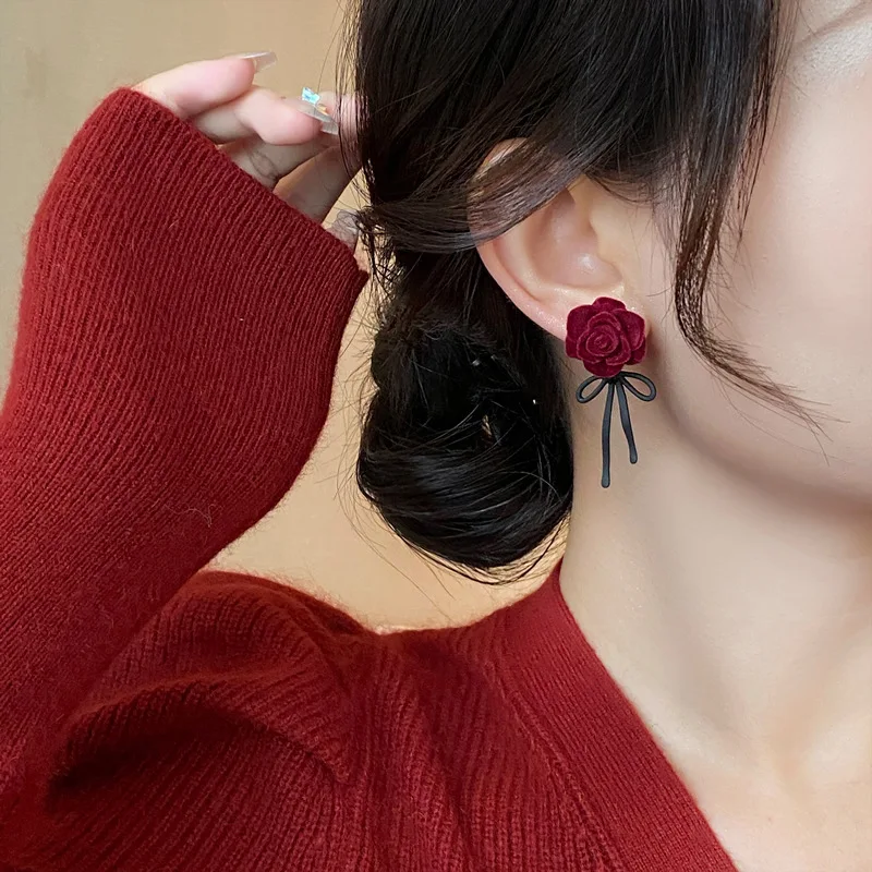 New Retro Flocking Flower Bow Earrings Luxury Roses Fashion Earings for Women Jewelry
