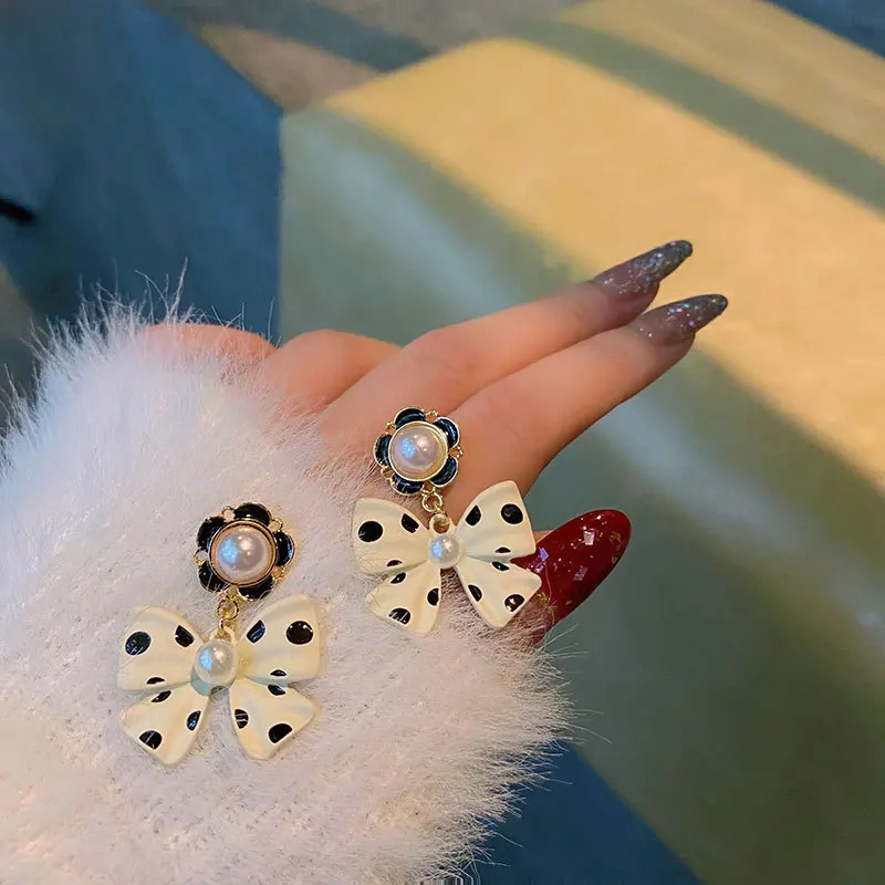 Punk Girl Earrings Korean Version High-end 2022 New Fashion All-match Niche Polka Dot Bow Pearl Earrings Wholesale Sales Brincos