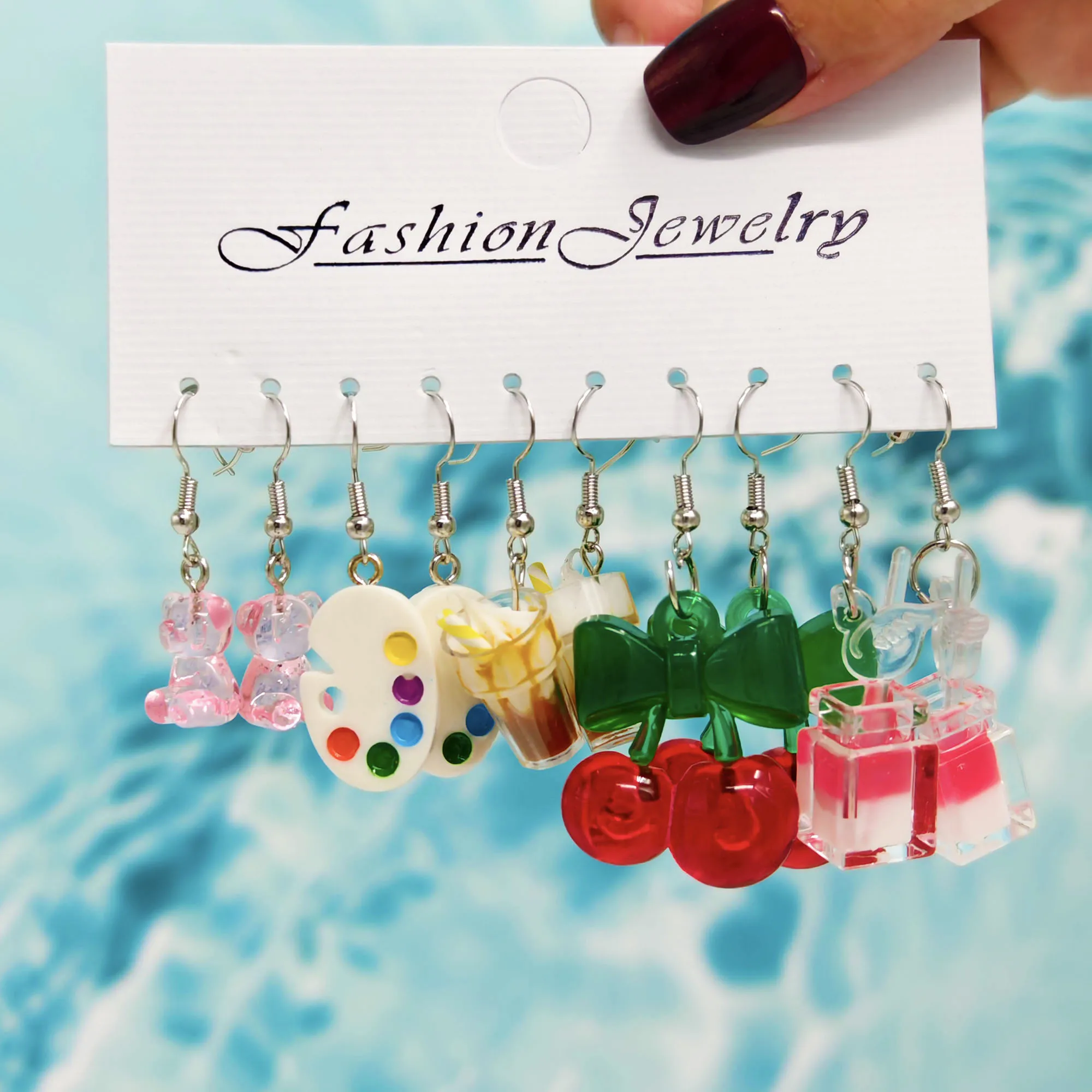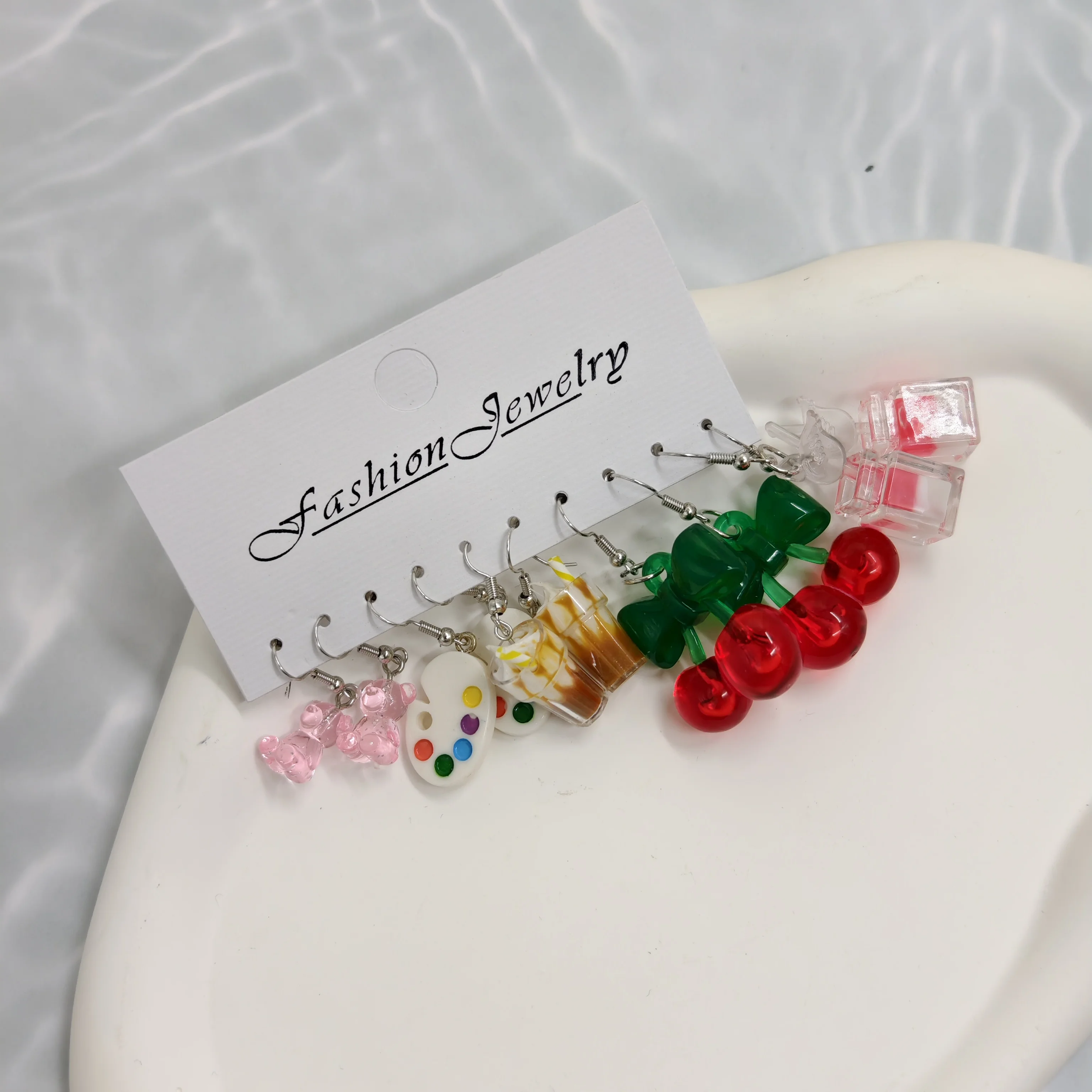 Small Fresh Candy colored Earrings Drawing Board Acrylic Colorful Little Bear Cherry Earnail Eardrop Set