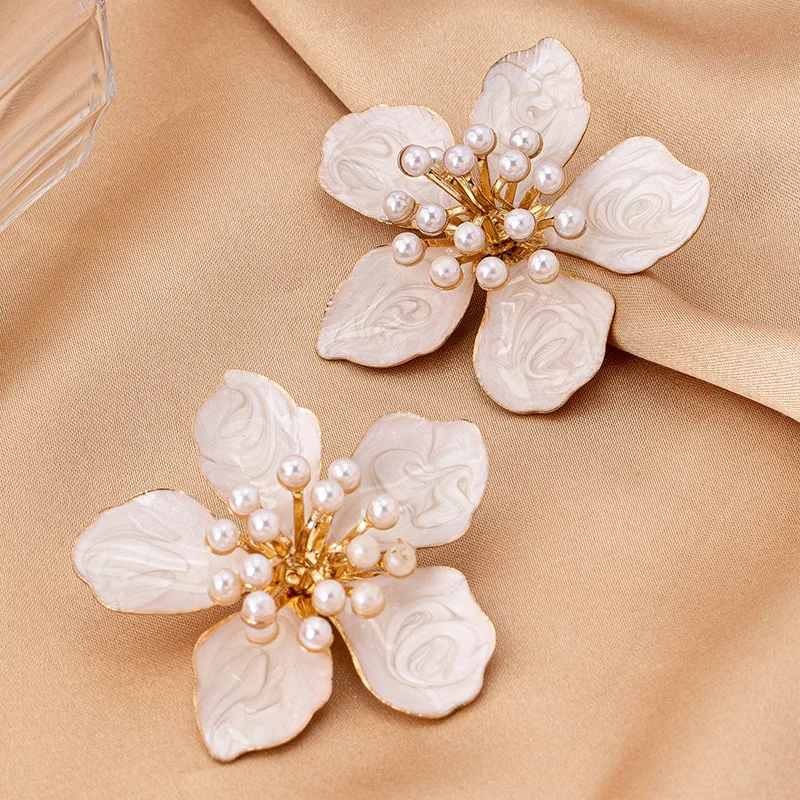 Stamping Metal Flower Enamel Petal Post Earrings For Women Imitation Pearl Multi Color Spring Summer Fashion Jewelry Gift MQF086
